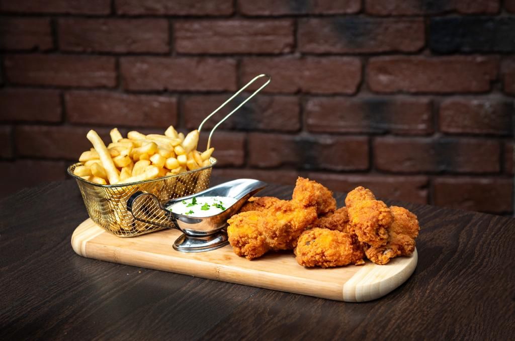 5 bucăți aripioare pui picante cu sos, cartofi și doză răcoritoare.