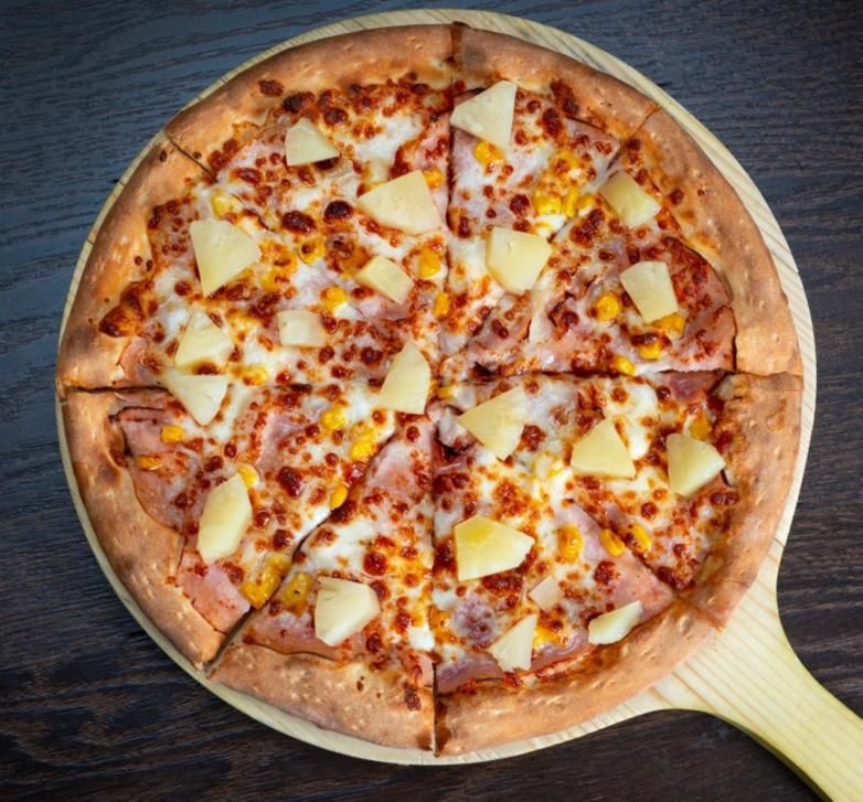 Ingrediente: sos, mozzarella, topping pizza, șuncă presată, ananas, porumb