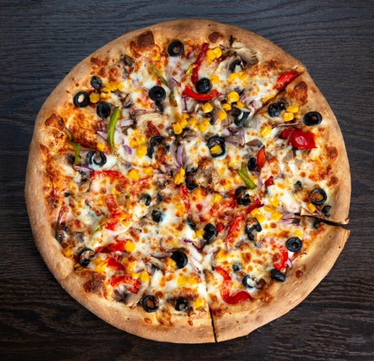 Ingrediente: sos, mozzarella, topping pizza, ciuperci, ceapă roșie, ardei mixt, măsline, porumb