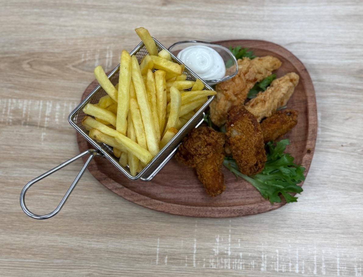 3 aripioare picante, 2 crispy, cartofi, sos, doză răcoritoare.